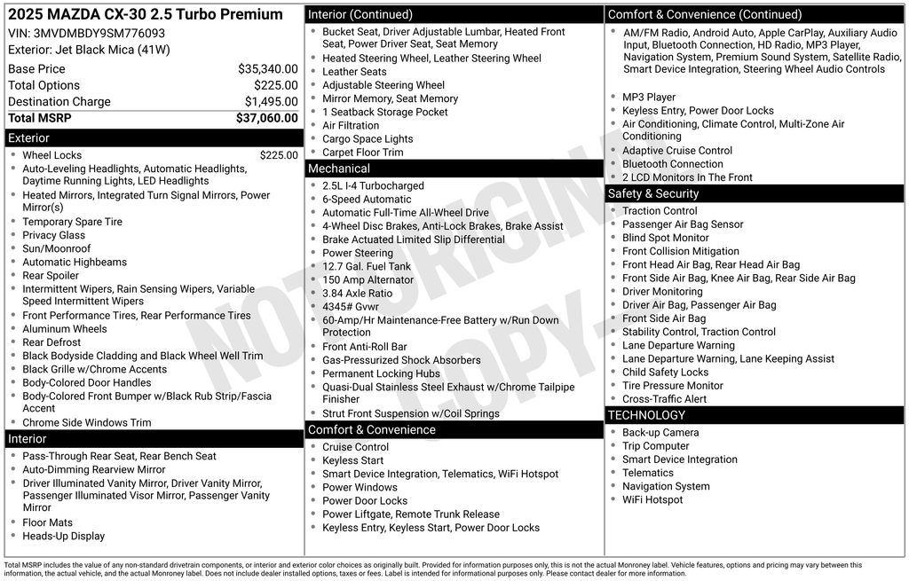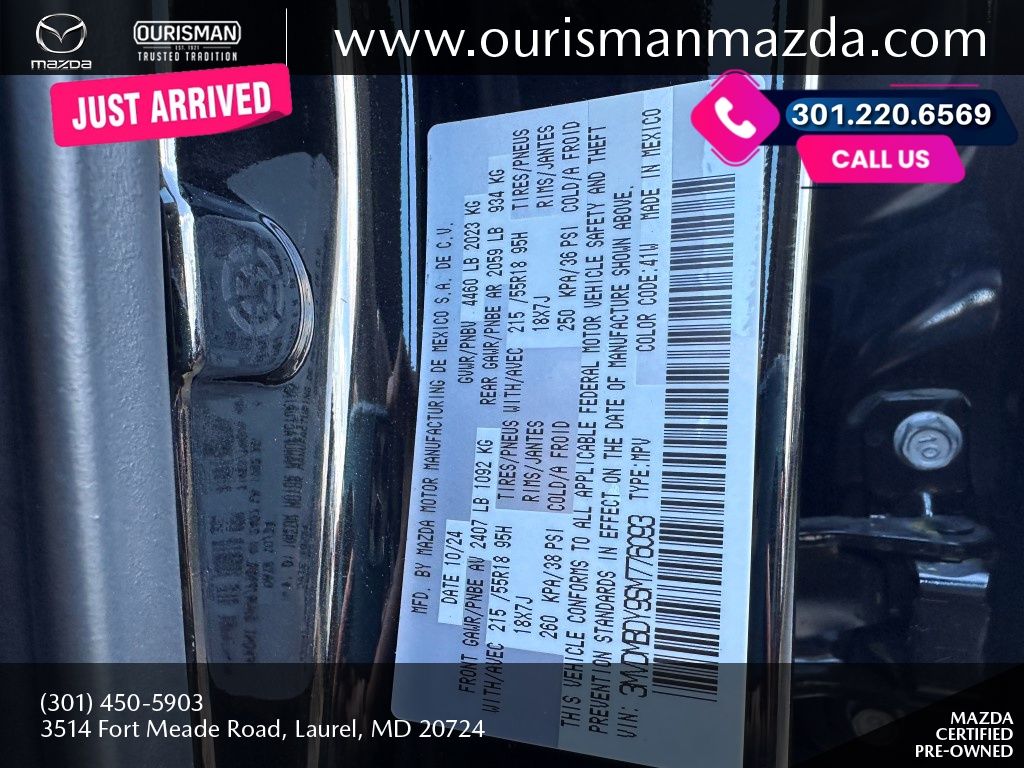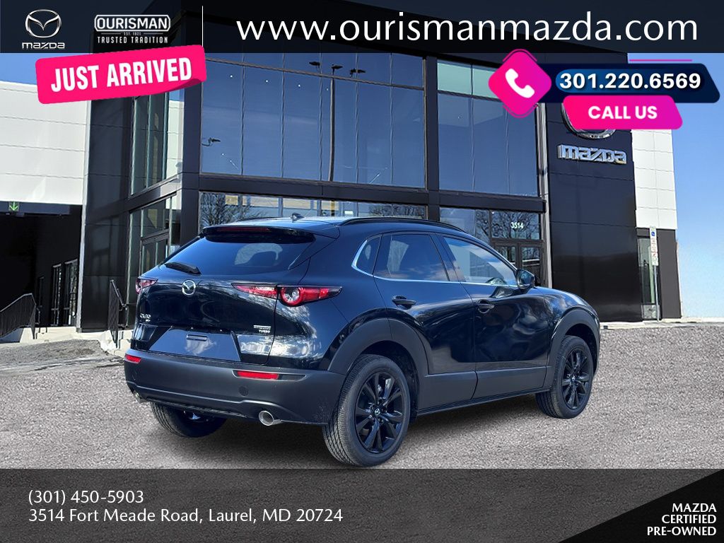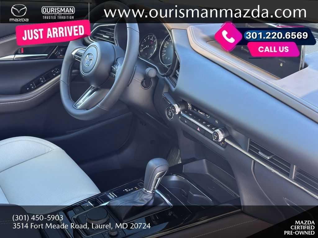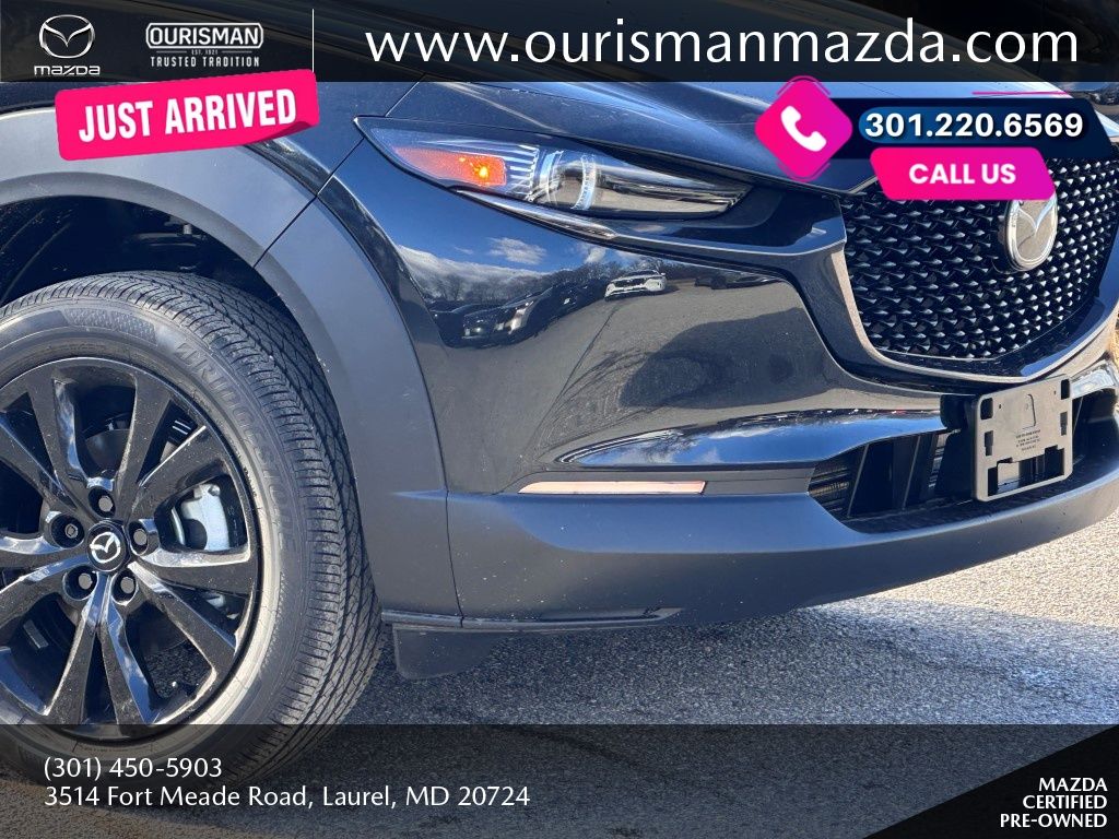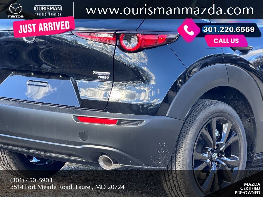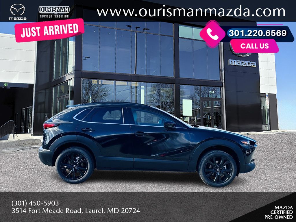 2025 Mazda CX-30 2.5 Turbo Premium Package Jet Black Mica AWD Certified. MAZDA CERTIFIED, NAVIGATION/NAVI/NAV SYSTEM/GPS, SUNROOF/MOONROOF, BLUETOOTH/HANDS FREE, REAR VIEW CAMERA/BACKUP CAMERA, BLIND SPOT MONITORING SYSTEM, LANE KEEP ASSIST/LANE MITIGATION/ACTIVE LANE ASSIST, HEATED SEATS, APPLE CARPLAY/ANDROID AUTO, PRE-COLLISION SYSTEM/BRAKE SYSTEM, LEATHER INTERIOR, ACTIVE CRUISE CONTROL/ADAPTIVE CRUISE CONTROL, HEATED STEERING WHEEL, LOCALLY OWNED, SERVICED HERE, POWER LIFT GATE/POWER TAILGATE, AWD, ALL WHEEL DRIVE, 1 OWNER CARFAX, PREMIUM SURROUND SOUND SYSTEM, POWER ADJUSTABLE SEATS, ADVANCED KEYLESS ENTRY, REAR CROSS TRAFFIC ALERT, SMARTPHONE WIRELESS CHARGER. Buyers should take pride in knowing that Maryland has one of the most comprehensive state inspections in the country. Awards: * ALG Residual Value Awards, Residual Value Awards We know you have done a great deal of research, and you don't have time for hours of back-and-forth negotiations. At Ourisman Laurel Campus, your hassle-free purchase is backed by our extensive Market Research. Our No-Haggle pricing ensures you the best value on your vehicle-no games, no gimmicks. Unlike our competitors, we don't add any additional fees to the posted price or certification. You pay only the posted price of the vehicle plus Sales tax, your registration and a MD processing charge of $800Not required by law. Come see why Ourisman Mazda, Mitsubishi, Hyundai, Nissan in Laurel (Ourisman Laurel Campus) offers you the best value for your money! Serving Frederick, Rockville, Hagerstown, Potomac, Baltimore, Silver Spring, DC, Howard County, Washington County, Montgomery County, Anne Arundel. Maryland State Inspected with over 120 point inspection performed by a trained technician. Buyers should take pride in knowing that Maryland has one of the most comprehensive state inspections in the country.
