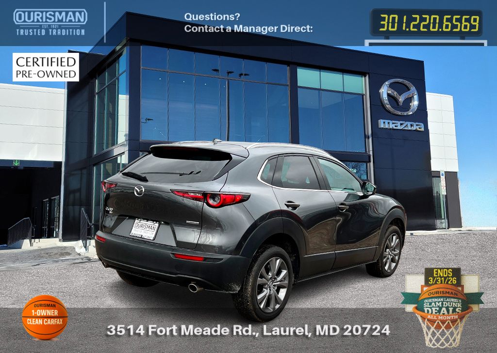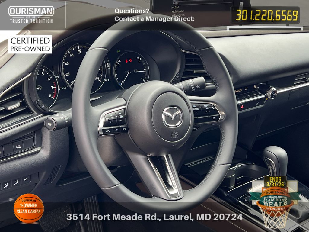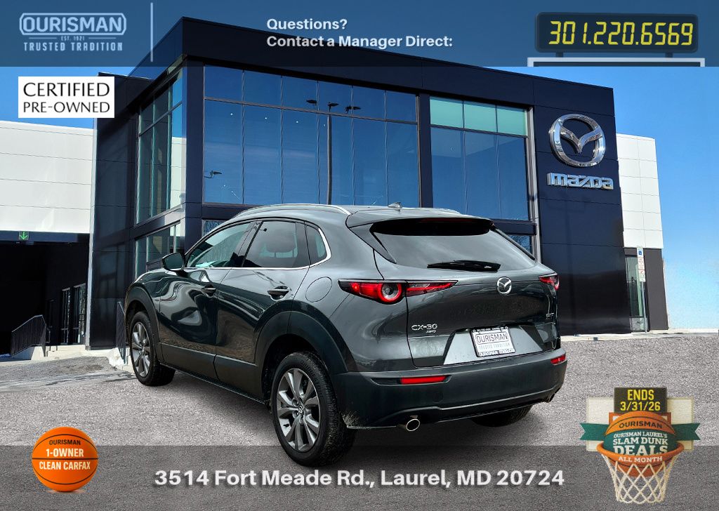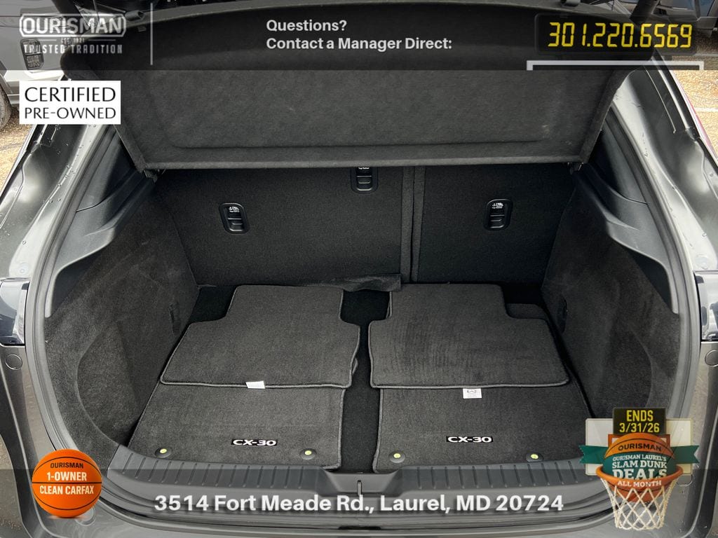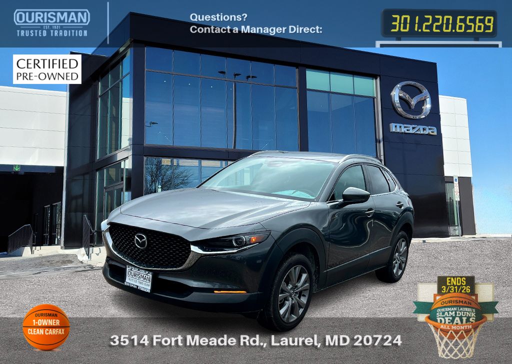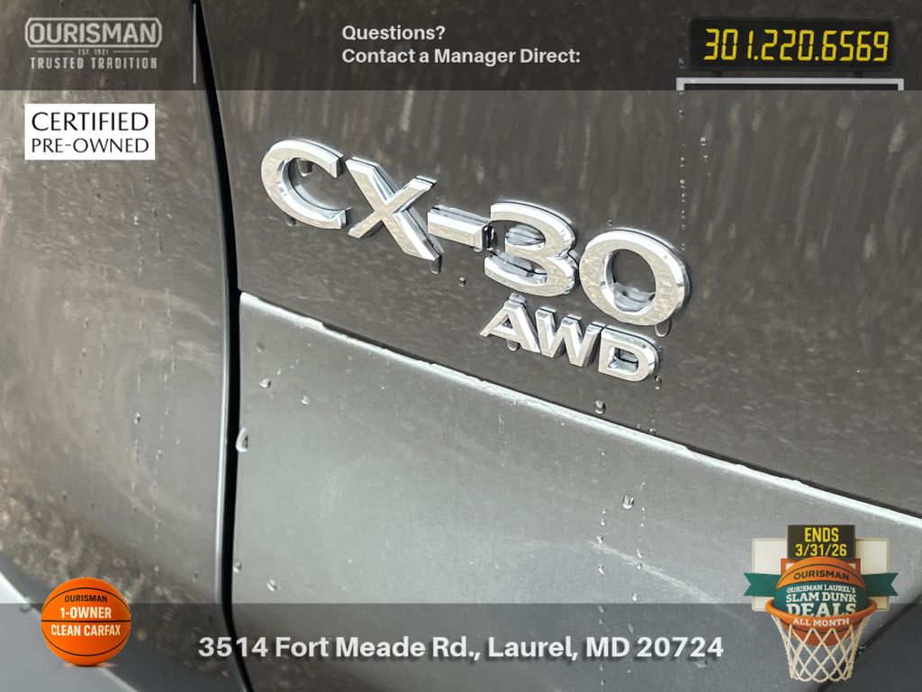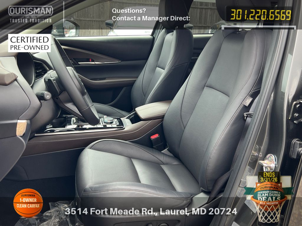 2025 Mazda CX-30 2.5 S Premium Package Machine Gray Metallic ACTIVE CRUISE CONTROL, ALL WHEEL DRIVE (AWD), APPLE CAR PLAY & ANDROID AUTO, BACK UP CAMERA, BLIND SPOT MONITOR, BLUE TOOTH, CARFAX ONE OWNER, CLEAN CARFAX HISTORY, HEATED SEATS, KEYLESS ENTRY AND PUSH BUTTON START, LANE ASSIST, LEATHER INTERIOR SEATS, MEMORY SEATS, MOBILE APP CONNECTED SERVICES, NAVIGATION, POWER DRIVER SEAT, POWER LIFTGATE, PRE COLLISION SYSTEM, PREMIUM BOSE SOUND SYSTEM, RAIN-SENSING WIPERS, REAR SEAT ALERT, SUNROOF/MOONROOF, WIRELESS PHONE CHARGER, WIRESS APPLE CAR PLAY & ANDROID AUTO. Mazda Certified Pre-Owned Details:
