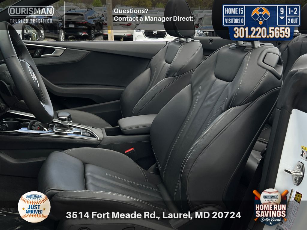 Adorned in a sleek and sophisticated White exterior, this A5 is a true head-turner. Its impressive list of custom features includes - ADAPTIVE CRUISE CONTROL, ALL WHEEL DRIVE (AWD), APPLE CAR PLAY & ANDROID AUTO, BACK UP CAMERA, BLUE TOOTH, CARFAX ONE OWNER, CLEAN CARFAX HISTORY, CONVERTIBLE, HEADS UP DISPLAY, HEATED SEATS, HEATED STEERING WHEEL, KEYLESS ENTRY AND PUSH BUTTON START, LANE ASSIST, LEATHER INTERIOR SEATS, LOW MILES, MEMORY SEATS, PARKING SENSORS, POWER DRIVER SEAT, PRE COLLISION SYSTEM, RAIN-SENSING WIPERS, SIRIUS XM RADIO. The Convenience Package further enhances the driving experience.