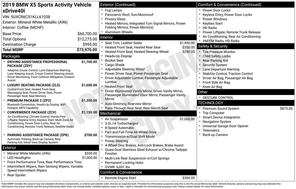 This is my second BMW X5 xDrive50i. Previous was the 2016 and now is the incredible 2019 X5 xDrive50i. It provides the all familiar power but with so much more in this version. Not only more power than my previous X5 but it is also very quiet in the cabin and very comfortable. Great access both in and out of the vehicle. I am 6'2" and don't like to fold myself in half to get in and out of a vehicle. Both versions of the X5 provided great access. This car provided me such joy at the start and the end of my work day despite having to deal with such hellacious traffic on the 405 and 101 every single day. The seats support every segment of my body and this new version adds more to the ventilation feature as well as many massage options. The massage levels don't provide enough strength to really get into the stress points in the neck, shoulders and low back but it is relaxing. I wish I could ratchet it up a few. The hot & cold cup holders, only for the front, are yet another added feature to this car that really makes this a new experience for me despite coming from a 3-year lease of what I thought would be a lateral move. I could not be more wrong. This car is so much more than a small incremental change from the previous model. The car drives so much smoother, quieter, and more refined that if I was blind folded and put behind the wheel and allowed to drive this car, I would be adamant that I was not driving an X5 or a BMW. The steering wheel is familiar yet so different. It is a beefy grip and again extremely comfortable. The iDrive is so much better than years past and I started with the original with my 2004 BMW 745Li. Lots of redundancy and intuitive. The gesture control requires time to learn and appreciate it. I don't feel that it is gimmicky as many reviews seem to categorize it. The HVAC system is super and reaches your desired climate very quickly. The audio, Harman Karden base system is just fine for me. I custom built my 2019 X5 with most options selected less the off-road air bags. Options selected: M Sport, Executive Tier, 21" M Y-Spoke bi-color wheels style 741M performance run-flats, Coffee Extended Merino Leather, Anthracite-Brown Poplar Matte Finish wood trim, Dynamic Handling Package, Luxury Seating Package, Acoustic Glass, Glass Controls, Heated front seats, armrests, and steering wheel, Leather Dashboard, and BMW rubber floor mats. When I had my 2004 BMW brake dust drove me nuts. The M Sport Brakes does bring back a slight bit of brake dust on the wheels but nothing remotely like in years past when it was common to see a BMW with black wheels beckoning to be cleaned. There is a lot to enjoy about this car and it truly starts my day off wonderfully and ends it the same. Enjoying the comfort of a very well climatized interior, super comfortable seats, great audio whether music or audible books to get my mind off of work or traffic (or both most of the time), and the pure fun to drive this car made this a worthy expenditure for the past 3-years and again as I venture into another 3-year lease with this incredible 2019 X5 xDrive50i MSport. The negative comment aside from the fee for Apple Car Play is the body flare at the door sills which some reviews focus on getting your clothes dirty but it is likely to be a maintenance issue to try not to damage the paint finish via shoes or grime scratching the finish. Not well thought out especially when running boards are not offered as a remedy. - 5.0