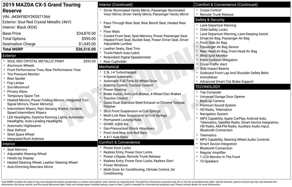 Experience the exceptional craftsmanship, performance, and technology that make the 2019 Mazda CX-5 Grand Touring Reserve a true standout in the SUV segment. Visit our showroom today and let us demonstrate how this captivating vehicle can enhance your driving experience.