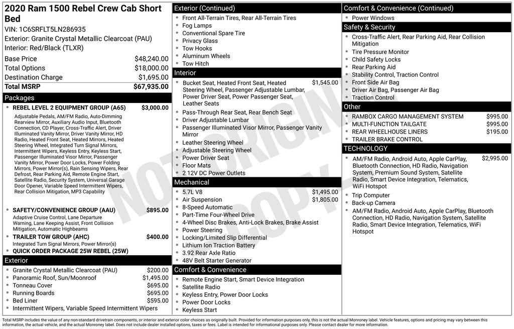 Whether you're tackling the daily commute or embarking on an off-road adventure, the 2020 Ram 1500 Rebel is the ultimate combination of power, capability, and refinement. Experience the difference for yourself â" schedule a test drive today and discover why this truck is the perfect choice for your next vehicle.